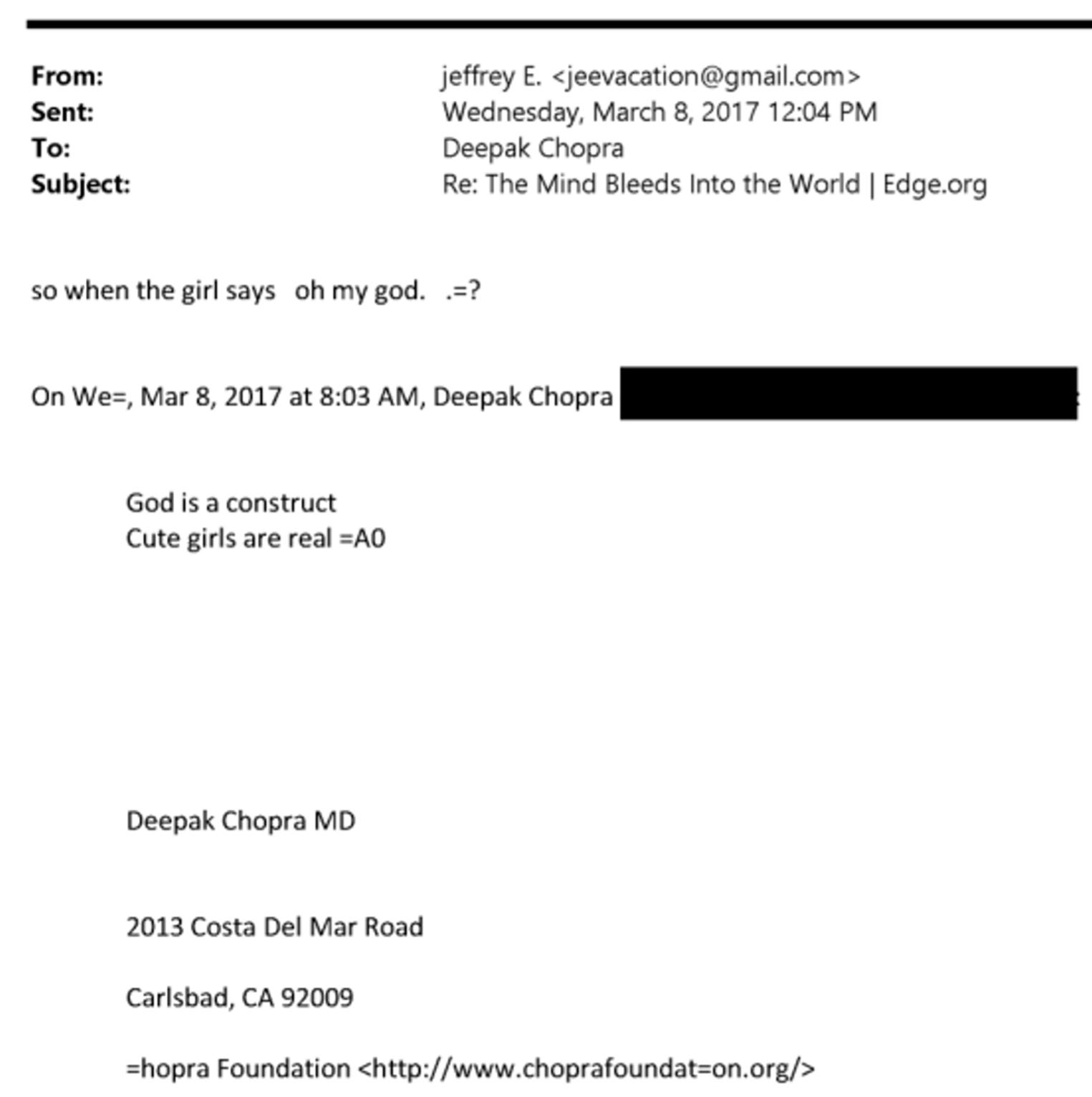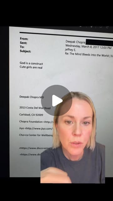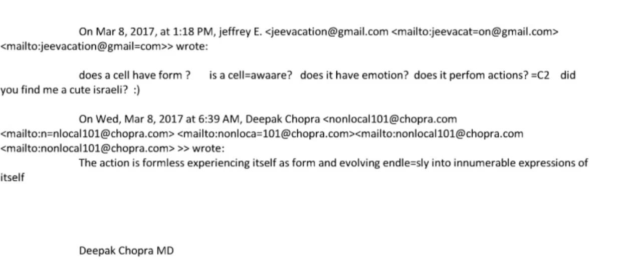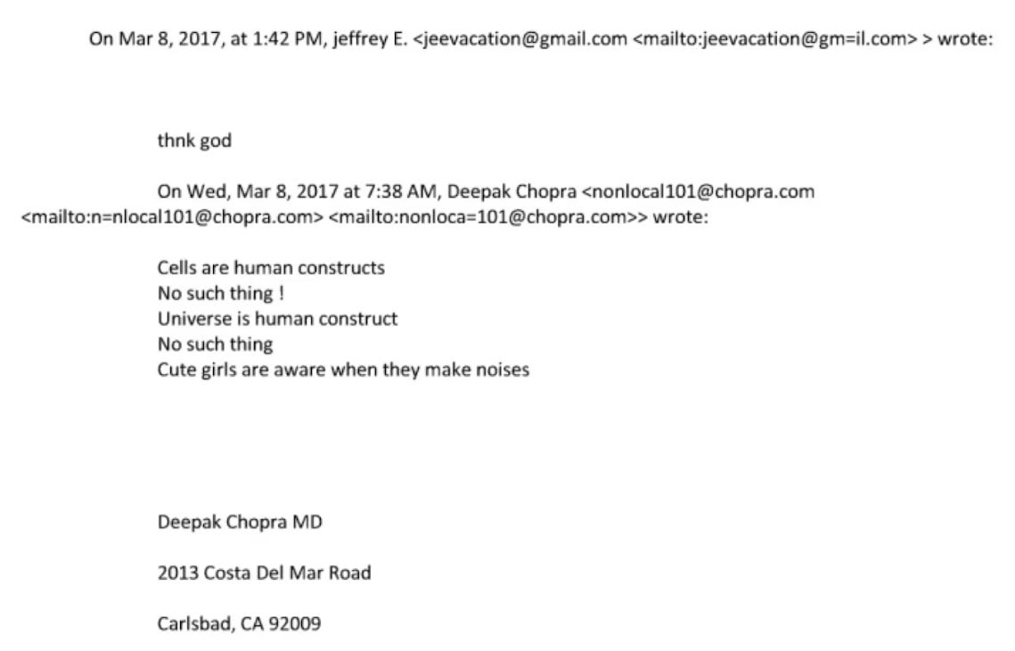 Deepak Chopra. Chopra and Epstein met at least 12 times between 2016 and 2019 for “meditation and funding meetings.” Here’s a lovely exchange between the famous ‘consciousness explorer’ and the infamous sex criminal: