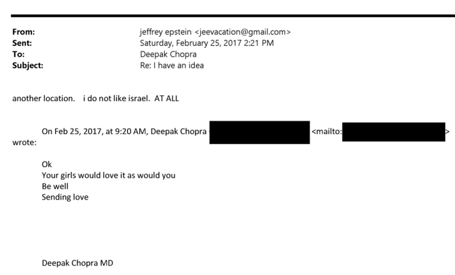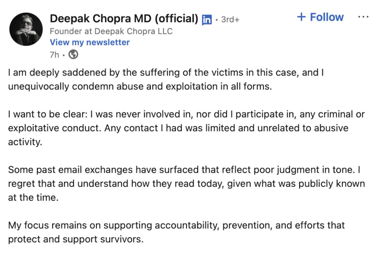 For the record, there is no evidence in the latest file dump that Epstein was working for Israel; if anything, there’s stronger evidence that he was in cahoots with Russia. Indeed — to return to an earlier guest star in the files — when Deepak Chopra (sleazily) invited Epstein to join him in Israel, Epstein replied