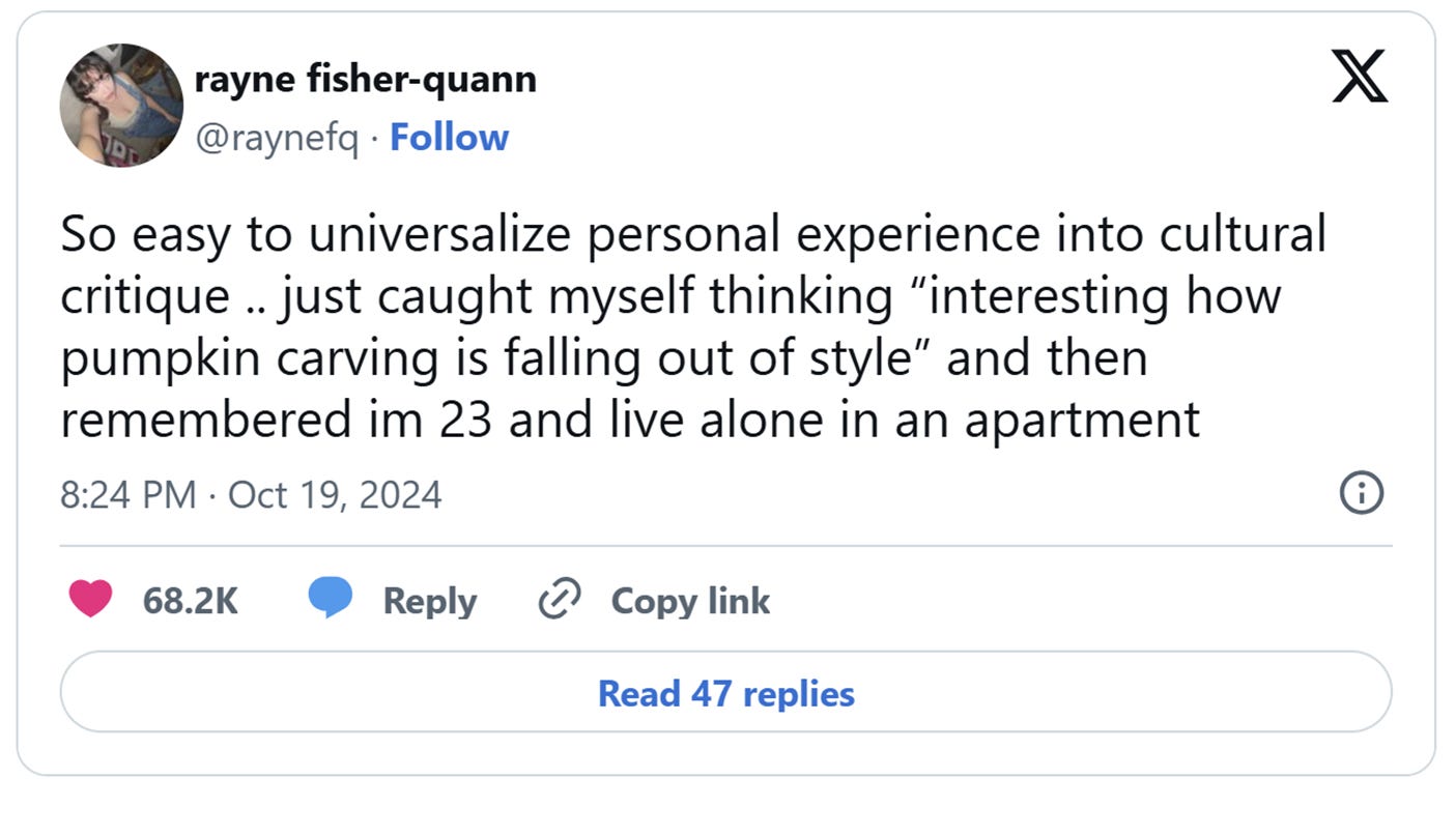 is not some rando on the internet. Her Substack is much bigger than this one, and has a whole lot of brilliant writing on it that you should read. She’s a perceptive, young critic and memoirist. Her tweet from October 19, 2024, is mildly internet-famous.Why do I love it? Because to me, it expresses my primary frustration with, well, almost every non-pluralistic political and cultural idea: the universalizing of subjective experience. Fisher-Quann (facetiously) ponders a philosophical reflection on the decline of pumpkin carving in America, and then realizes that, oh right, this is just her subjective experience, in this case as someone who is no longer a kid and doesn’t have kids of her own. The decline in pumpkin carving is not something happening to society; it’s something happening to her.